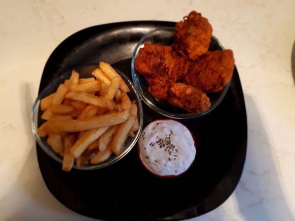Szóval 2 adag burgonyát kisütöttem, majd szimplán megsóztam. A mártogatós elég intenzív ízű, és a hús is elég fűszeres, így a krumpli most csak enyhén sós volt.
